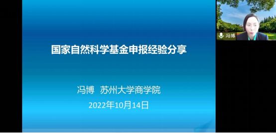 10月14日下午,苏州大学冯博教授做客半岛体育(中国)官方网站办学40周年系列名家论坛,为我校师生做了一场关于《国家基金申报经验分享》的线上学术报告,半岛体育(中国)官方网站骨干教师、研究生等百余人参加。报告会由半岛体育(中国)官方网站院长杜建国教授主持。